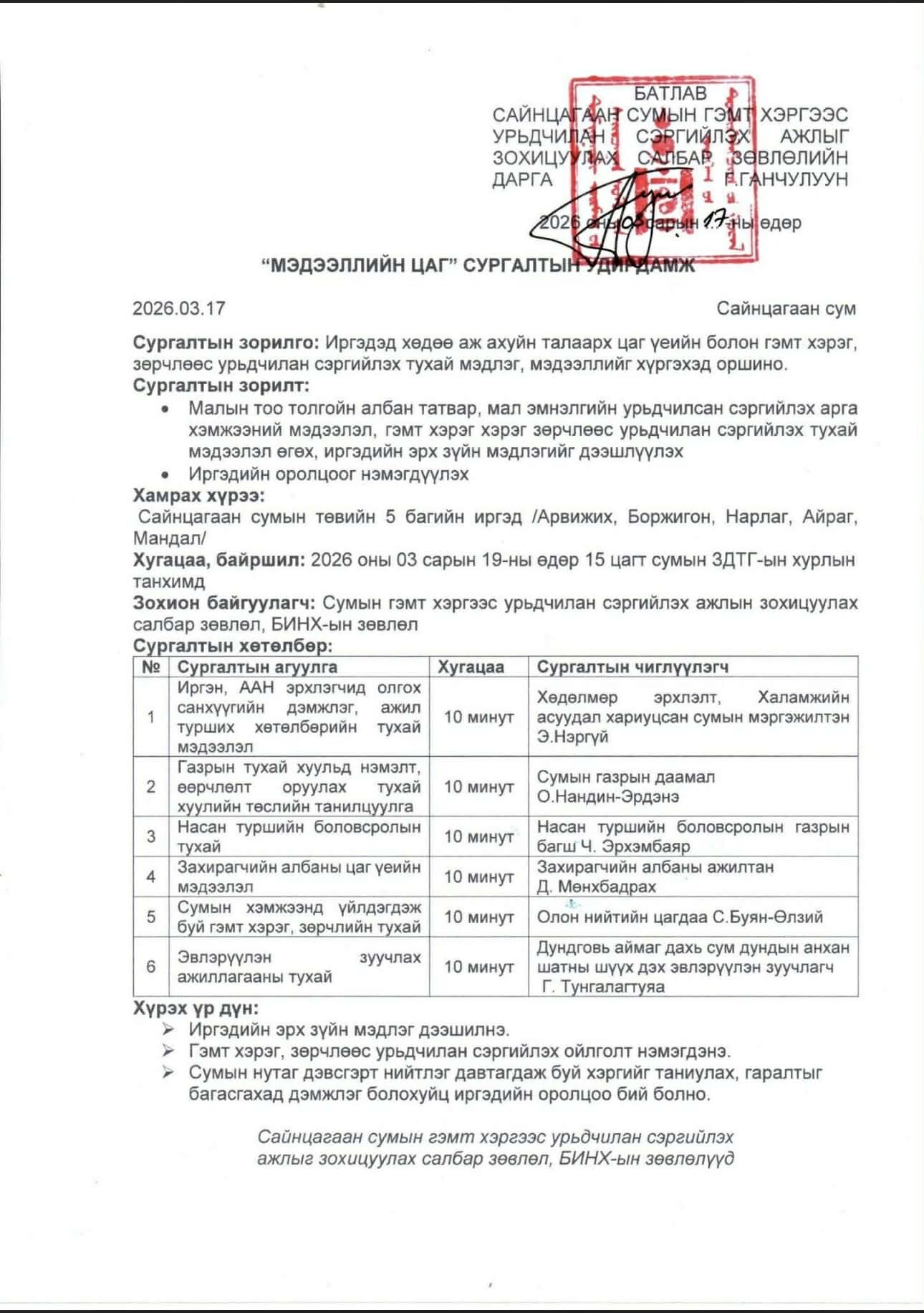 2026-03-20 00:00:00 | 13Сайнцагаан сумын төвийн 5 баг /Арвижих, Боржигон, Нарлаг, Айраг, Мандал/-ийн иргэдэд зориулсан “Мэдээллийн цаг” сургалтанд Эвлэрүүлэн зуучлагч Г.Тунгалагтуяа “Эвлэрүүлэн зуучлах ажиллагаа” сэдвээр мэдээлэл өгөв.