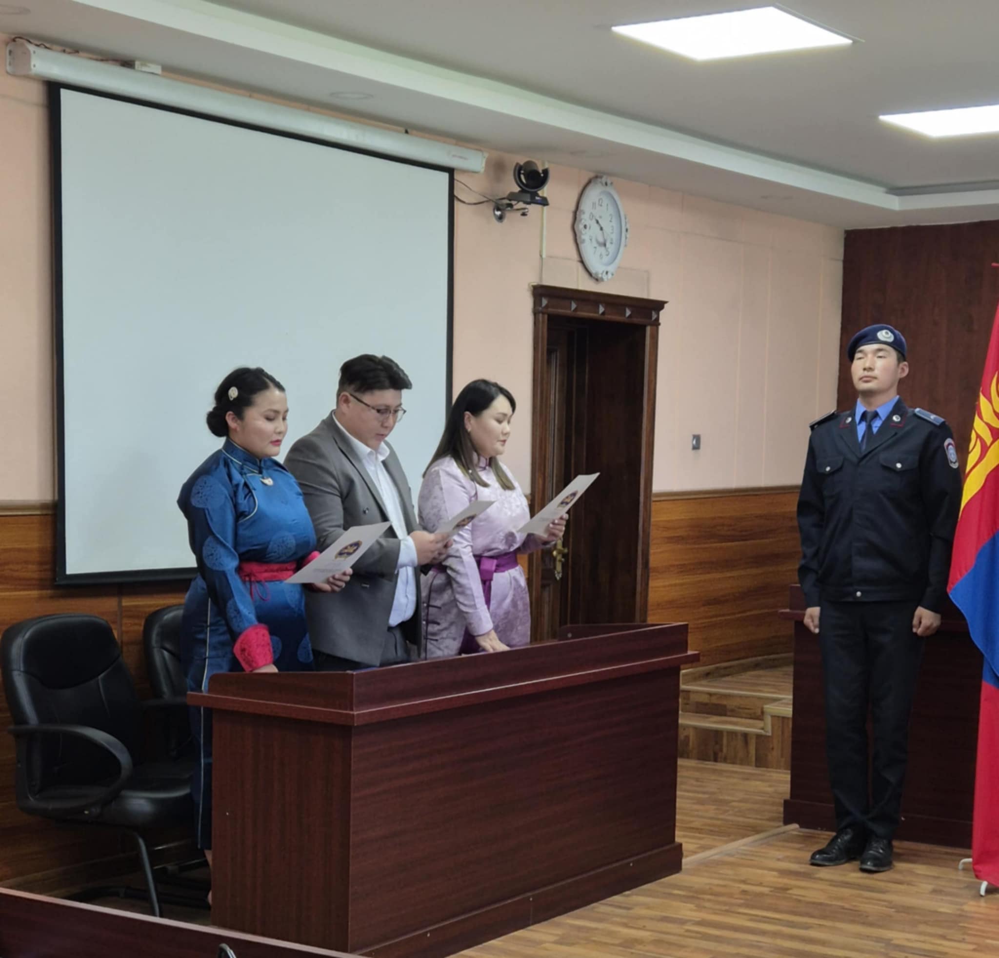 2025-07-09 00:00:00 | 269Монгол Улсын Ерөнхийлөгчийн 2024 оны 84 дүгээр зарлигаар батлагдсан "Төрийн жинхэнэ албан хаагчийн тангараг өргөх ёслолын журам"-ын дагуу Дундговь аймаг дахь шүүхийн Тамгын газрын шүүгчийн туслах О.Янжиндулам, шүүх хуралдааны нарийн бичгийн дарга Б.Цэрэнбадам, О.Билгүүн нар 2025 оны 07 дугаар сарын 07-ны өдөр Төрийн жинхэнэ албан хаагчийн тангараг өргөлөө.
