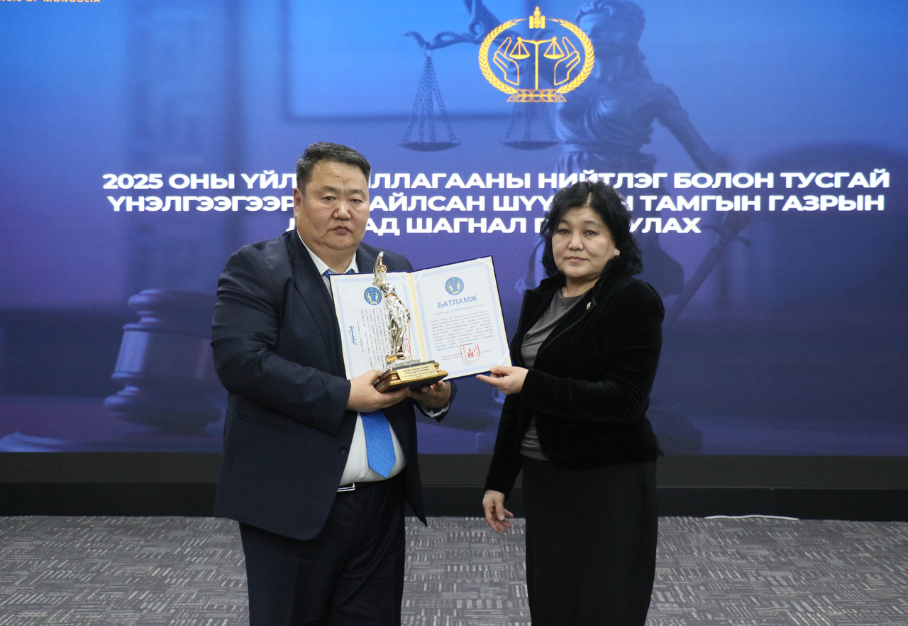 Шүүхийн ерөнхий зөвлөлөөс “Шилдэг ажил хэрэгжүүлсэн шүүхийн Тамгын газар”-аар шалгарсан Дундговь аймаг дахь шүүхийн Тамгын газрын дарга Ц.Мөнгөнцоожид Шүүхийн ерөнхий зөвлөлийн дарга П.Золзаяа шагналыг гардуулан өгч, баяр хүргэв.